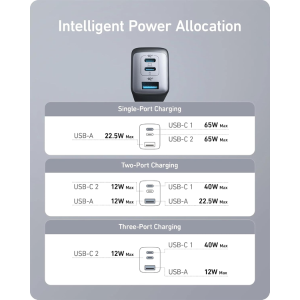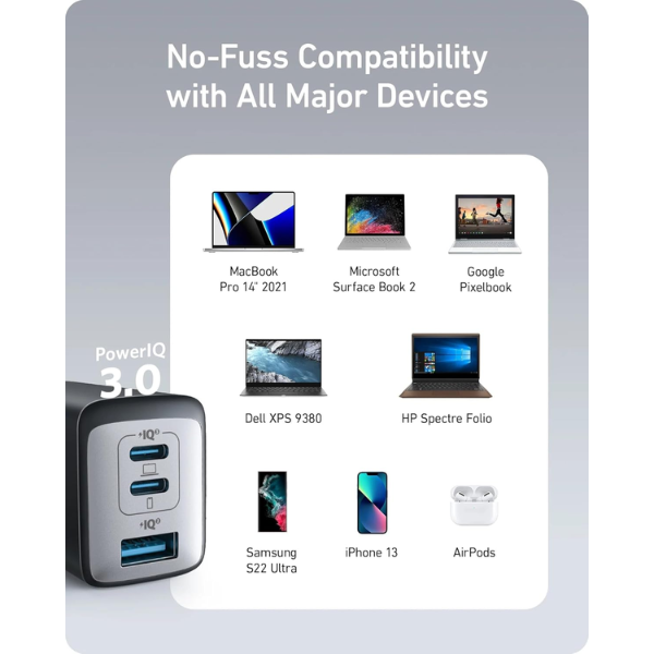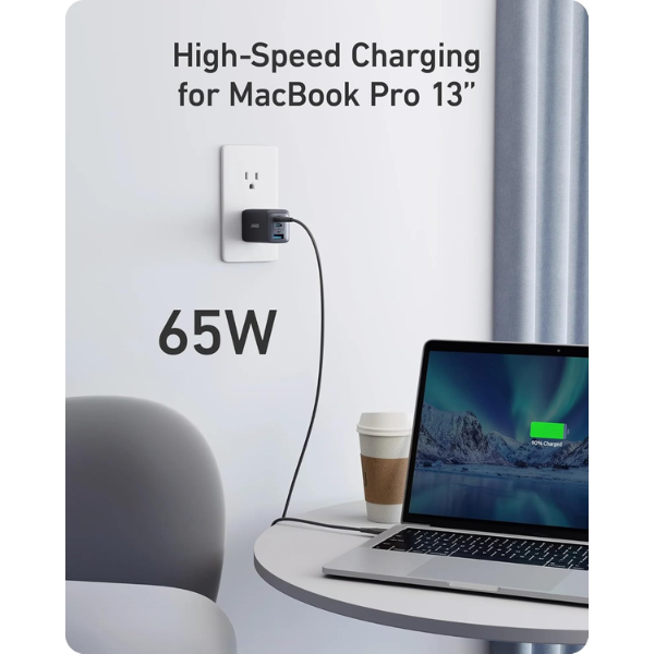 يتميز بتقنية GaN II المتطورة التي توفر طاقة إجمالية تصل إلى 65 واط عبر ثلاثة منافذ، ليمنحك حلاً متكاملاً لشحن الكمبيوتر المحمول، الجهاز اللوحي، والهاتف في وقت واحد — وكل ذلك في تصميم مدمج وسهل الحمل مثالي للسفر.