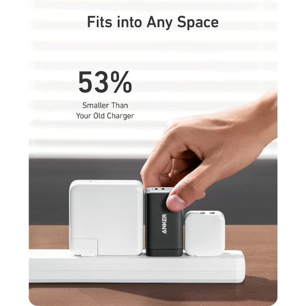 مصنوع باستخدام تقنية الجاليوم نيتريد (GaN II) الجيل الجديد، التي تُحسن كفاءة تحويل الطاقة وتقلل من الحرارة، مع تصميم أصغر بنسبة 53% من شواحن اللابتوب التقليدية بقدرة 65 واط.