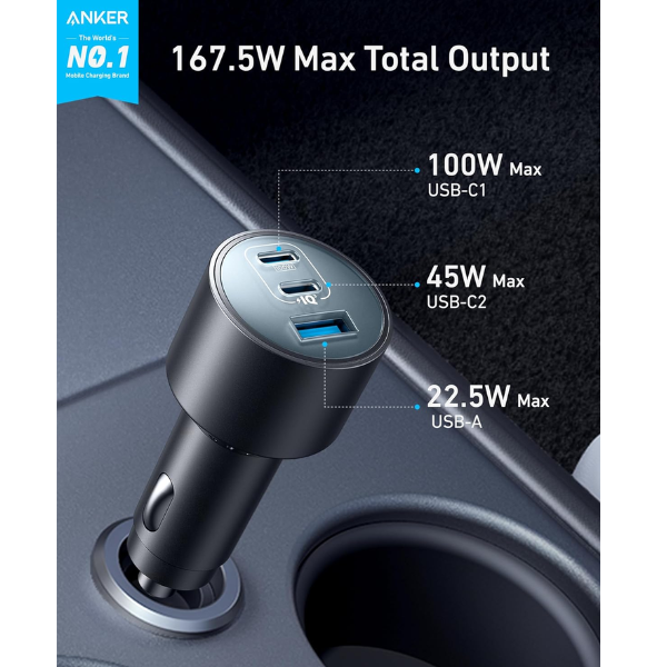 شاحن سيارة Anker Nano بقوة 167.5 واط (A27376A1) - 3 منافذ USB-C وUSB-A سريعة