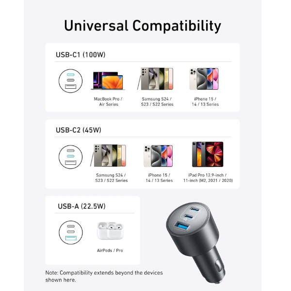 قوة لا مثيل لها - أحد أقوى شواحن السيارات في العالم، قادر على شحن أجهزة الكمبيوتر المحمولة والأجهزة اللوحية والهواتف في وقت واحد.