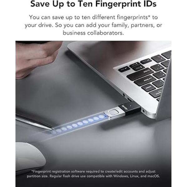 Protect your sensitive daa with fingerprint authentication — unlock your drive in less than 1 second. Register up to 10 unique fingerprints, making it perfect for personal use or shared environments like families or small teams.